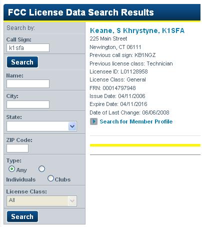 - An amateur’s current license class is now listed in the Call Sign Search. Extraneous numbers in the amateur’s FRN have also been removed.