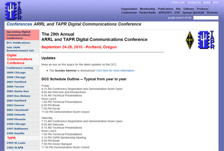 Next month, the folks on the cutting edge of ham radio hold their annual meet to show-and-tell what they are doing out there on that edge. The 29th annual ARRL/TAPR Digital Communications Conference (DCC) occurs on September 24-26, 2010 neear Portland, Oregon, so it is not too early to make your plans to attend the big event.