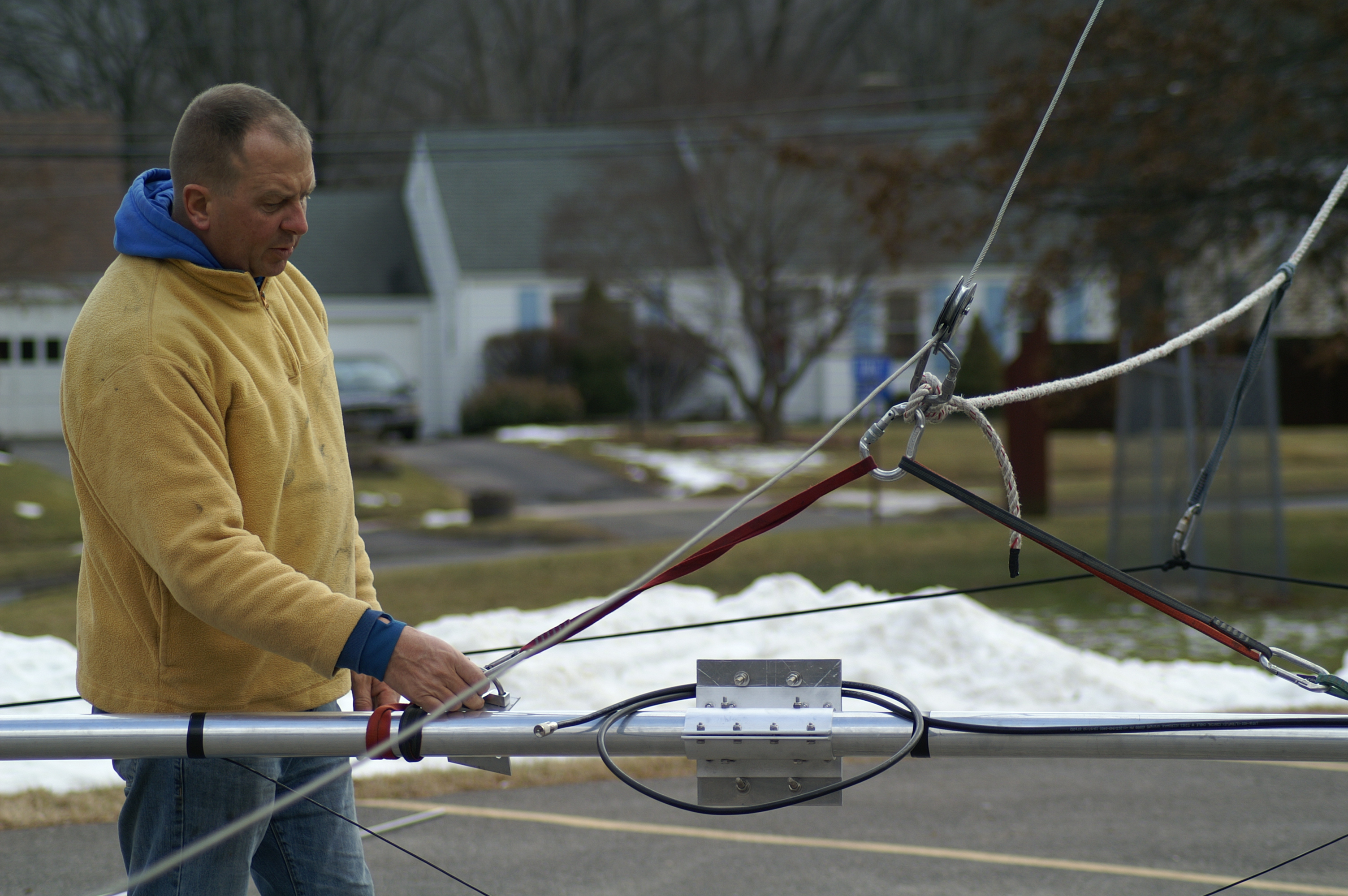 Matt Strelow, KC1XX, and Andrew Toth of XX Towers came to Newington earlier this week to replace most of the damaged items. Together with Carcia, they removed the damaged 80 meter wire cage antenna and repaired the element on the 10 meter Yagi on the north tower. They also removed the two damaged 40 meter Yagis on the center tower (a 120 foot Rohn 65 tower) and replaced them with two new Cushcraft XM240 40 meter Yagi antennas. For W1HQ, they replaced the damaged rotator with a new Yaesu G-1000DXA rotator. Before Strelow and Toth arrived, Carcia had already assembled both of the new 40 meter Yagis and prepared the new W1HQ rotator and its control cable.